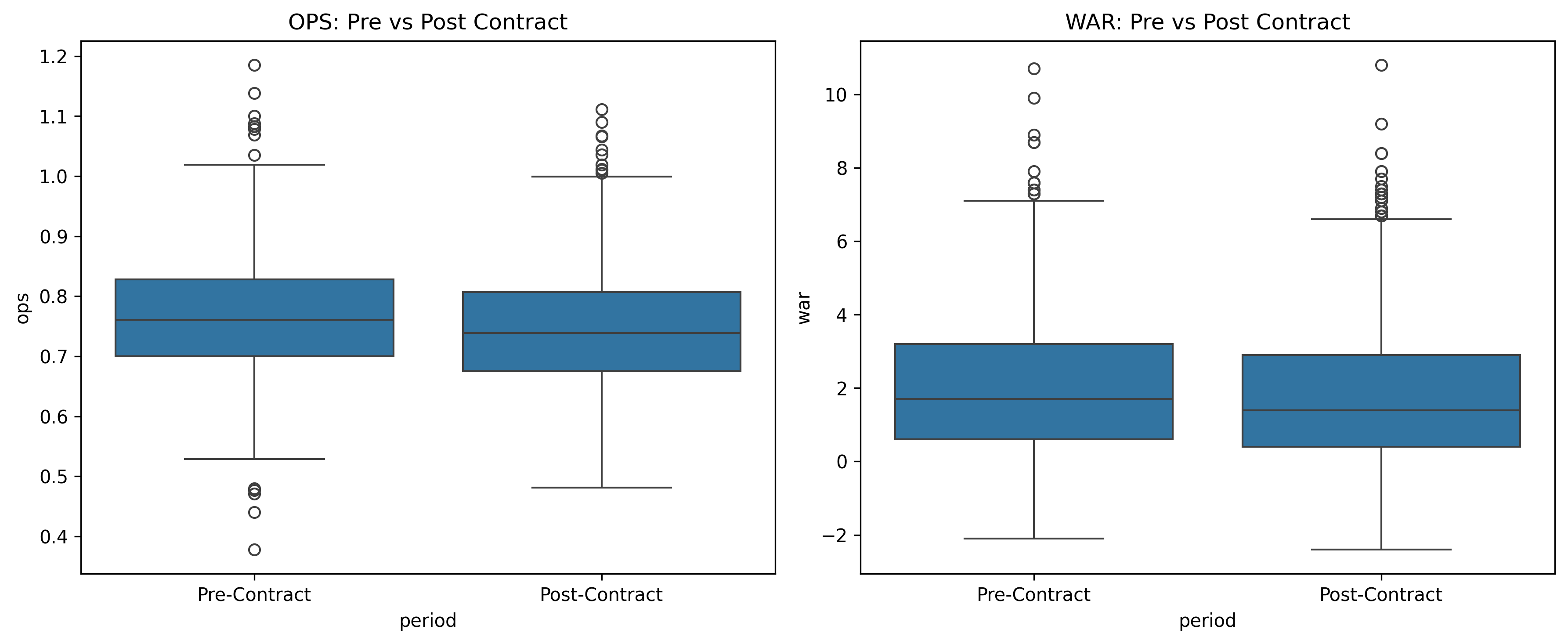 Our analysis examined 1,985 player-seasons across 300 MLB players from 2018-2025, identifying 495 instances of “big contracts” defined as salary increases exceeding 50% or $5 million year-over-year. Descriptive statistics revealed an apparent performance decline following contract signings, with mean OPS decreasing from 0.765 to 0.745 (Δ = -0.020) and mean WAR declining from 2.113 to 1.872 (Δ = -0.241). Figure 1 displays the average performance trajectory around contract signing , while Figure 2 presents box plot comparisons of pre- and post-contract distributions.