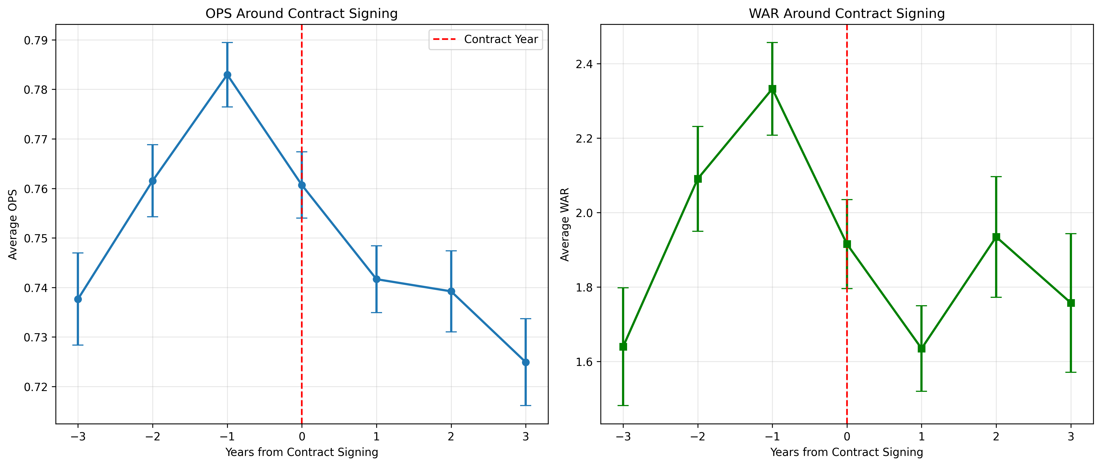 This analysis investigates whether signing large contracts negatively impacts MLB player performance, examining the commonly held belief that financial security leads to decreased motivation and effort. Using data from 300 MLB hitters across the 2018-2025 seasons (1,985 player-seasons), we identified 495 “big contract” events and compared player performance before and after contract signing using OPS and WAR as primary performance metrics.
