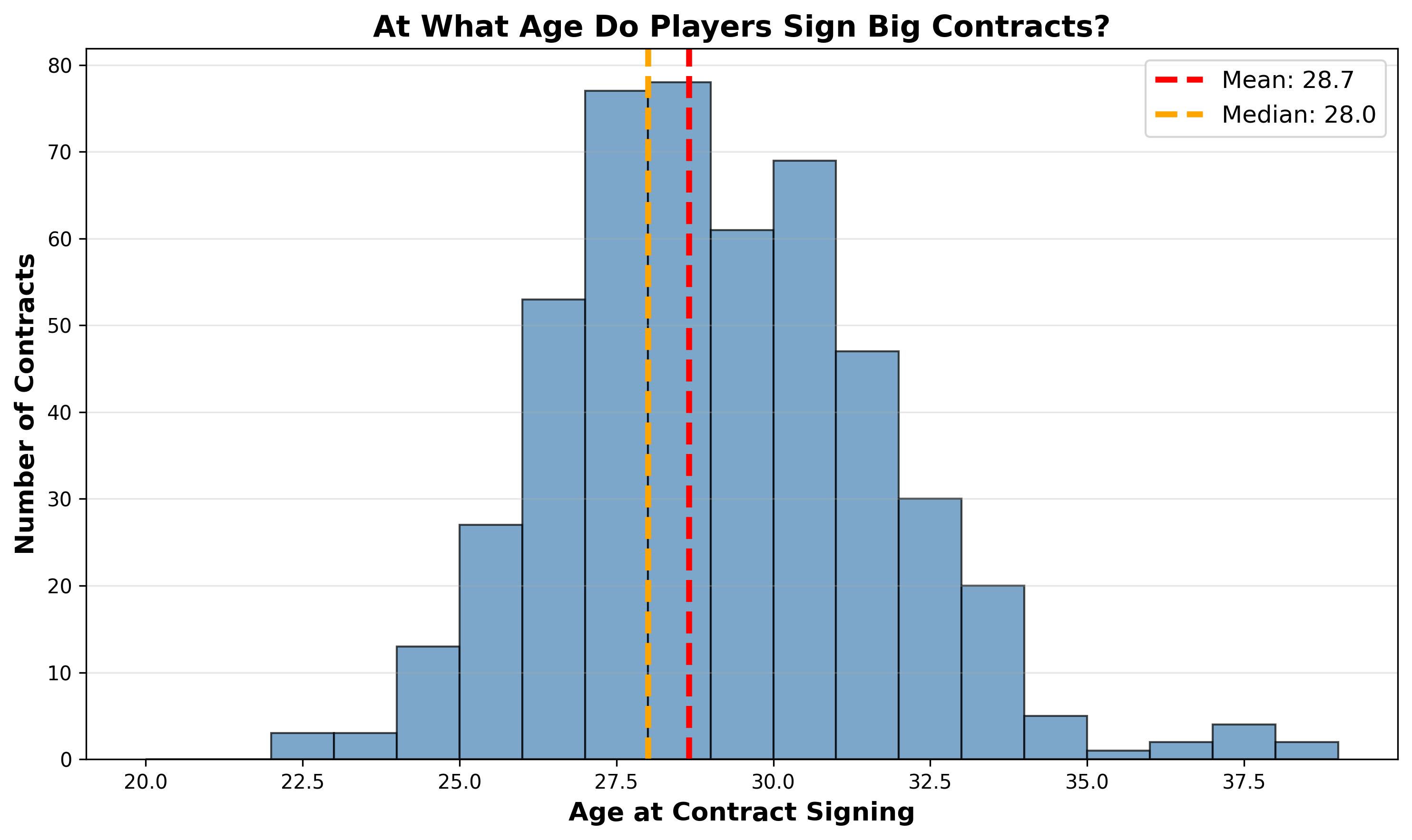 Players typically sign their largest contracts between ages 28-31 (see Figure 3), coinciding with the onset of natural performance decline.