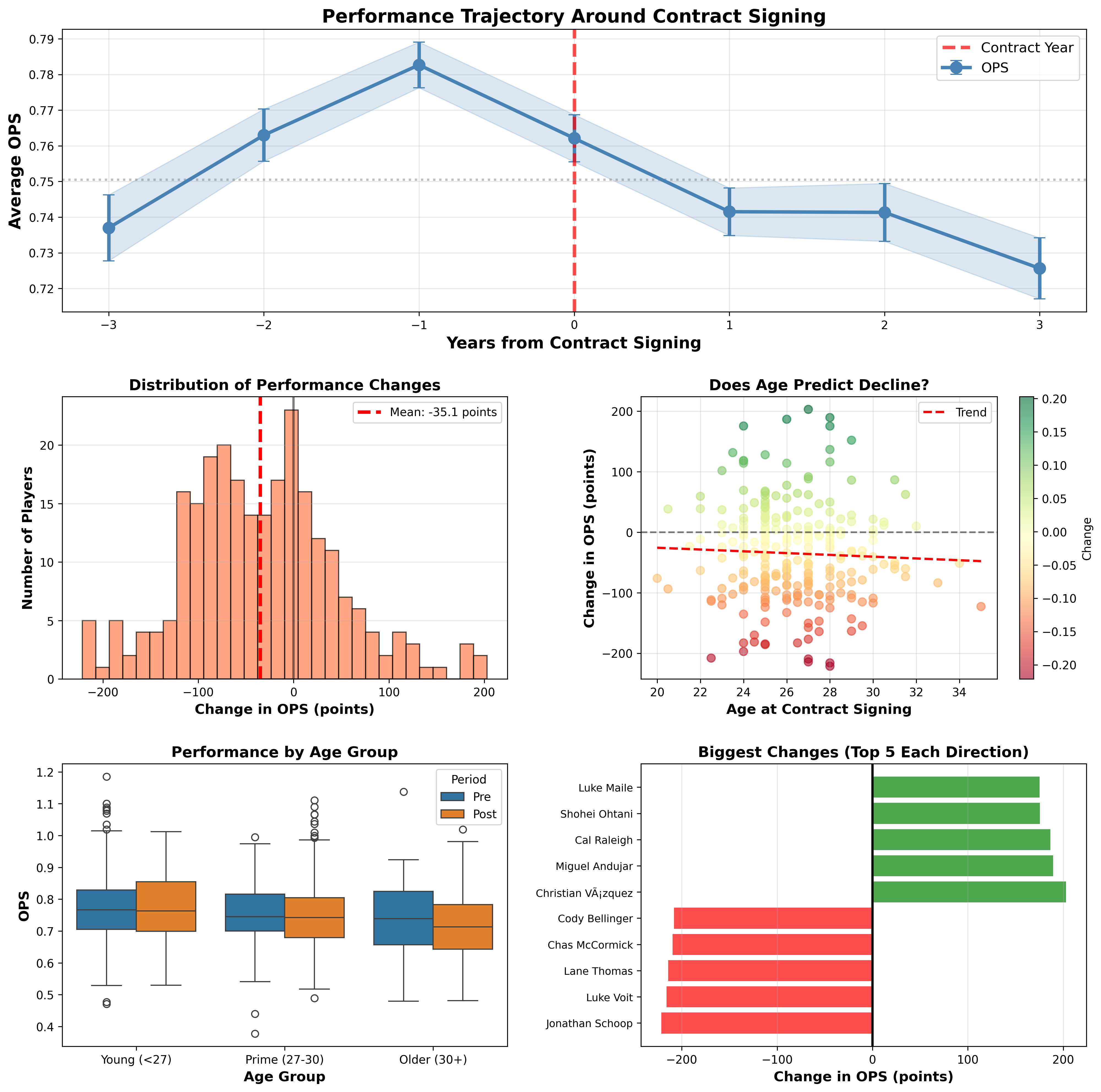 The key insight is that the apparent performance decline following large contracts is primarily explained by natural aging patterns rather than any motivational or behavioral change induced by financial security. Players typically sign their largest contracts between ages 28-31, right when natural performance decline begins. The significant age coefficient (p = 0.010) combined with the non-significant contract coefficient (p = 0.113) demonstrates that age—not contract status—drives the observed performance changes. This suggests high-profile cases like Anthony Rendon’s post-contract decline represent outliers reflecting injury issues or player-specific circumstances rather than systematic motivational effects.